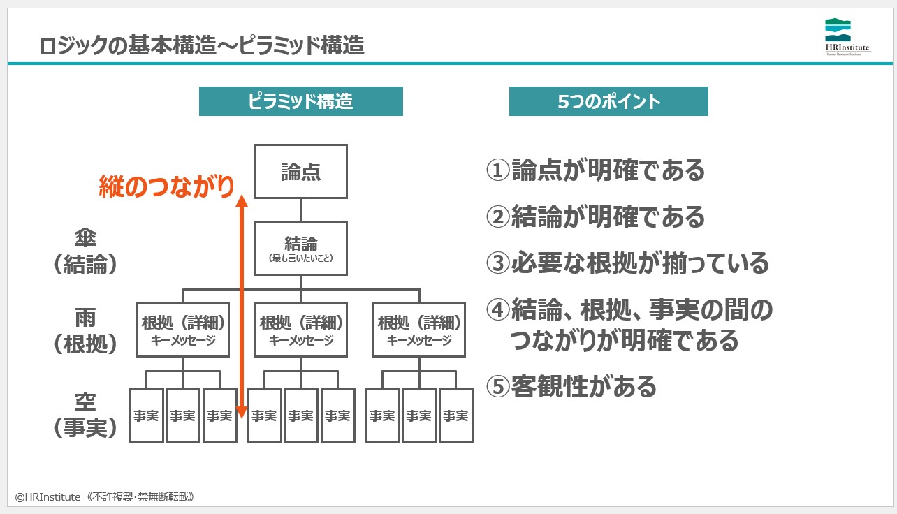 - ビジネスパーソンとしての思考の土台となるロジカルシンキングとは、“正しさ”を追求する思考ではなく、“相手にとっての分かりやすさ”を実現する思考であるということを理解します。