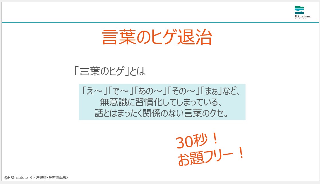 「言葉のヒゲ」(「えー」「あー」といった話の内容に関係ない言葉)を削るトレーニングを通じて、普段気づいていない自分のクセに気づくことができます。話し方を自分でコントロールできるようになると、自信が芽生え、堂々と振る舞えるようになります。