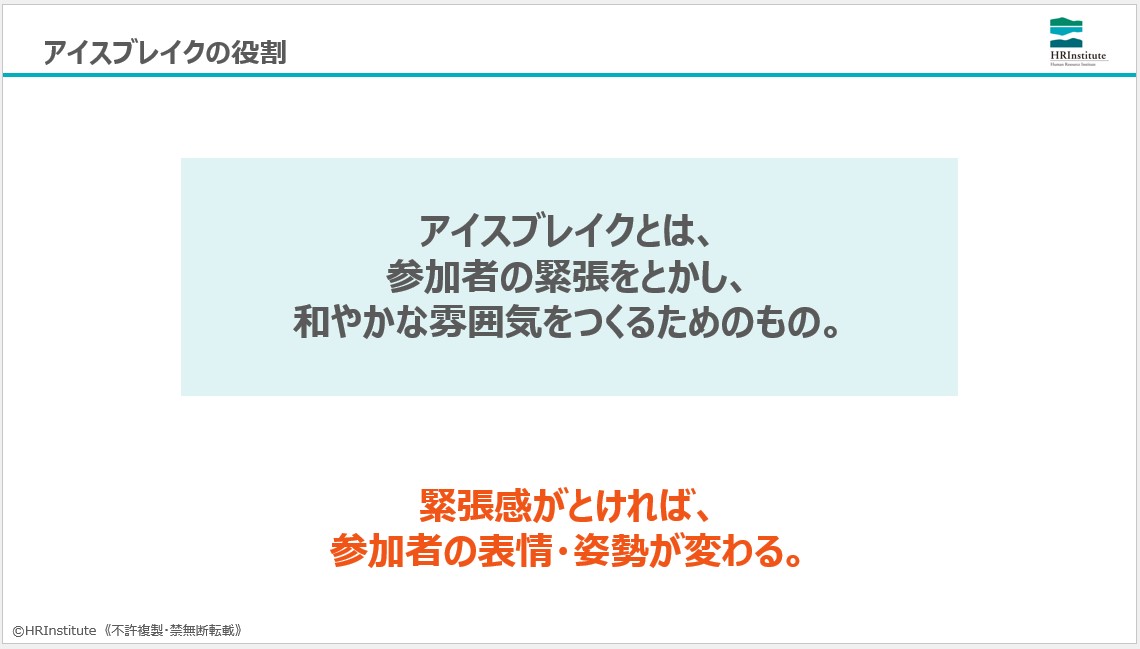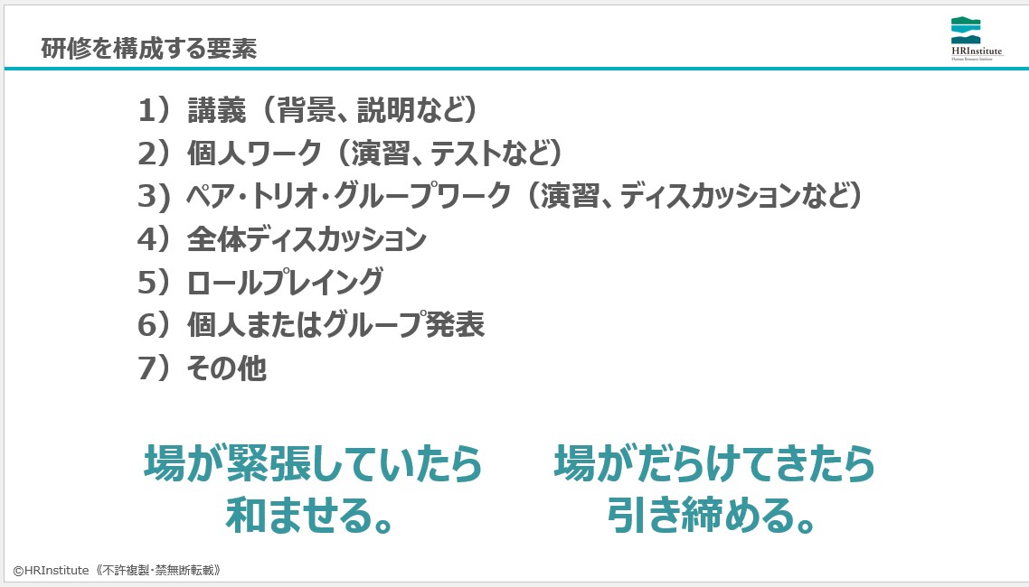 受講者の興味を引き出して巻き込んでいくファシリテーションにトライします。効果的な質問、クイズの出題、ペアでの検討などを組み入れて、自分の講義をよりリズミカルに運営するノウハウ・ドゥハウを繰り返し実践します。