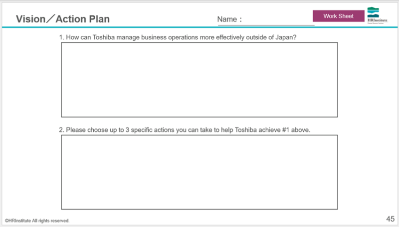 最後のパートでは、「自社がグローバルで更なるプレゼンスを発揮するために、自分が支援できることは何か」を考え、アクションプランを作成します。
