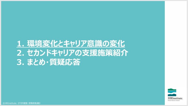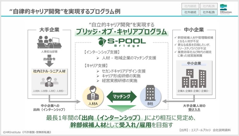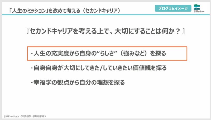 研修内容の紹介に続き、セカンドキャリアを具体的に描くための施策として、弊社HRインスティテュートのセカンドキャリアワークショップや、エスプールブリッジさまの「ブリッジ・オブ・キャリア」についても説明しました。