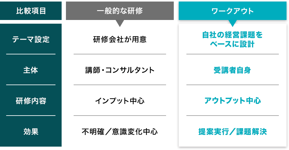 しかし、ワークアウトは組織課題に対して「提案を構築し、実行まで担う」ため、知識の定着と現場での実行力が同時に身につく育成手法です。