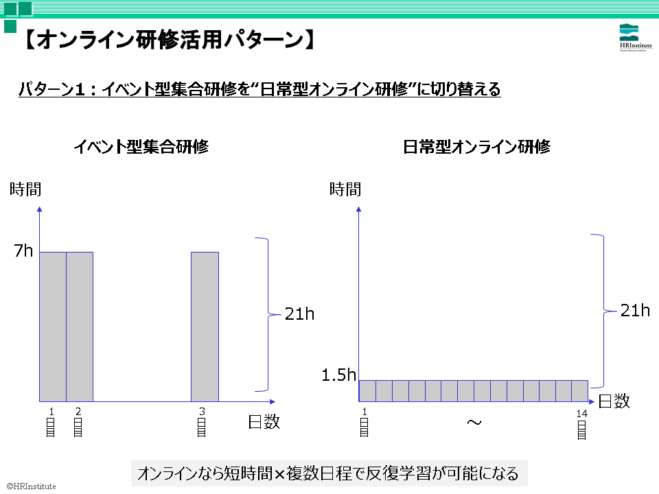最後に、テレワーク下において、新しい人材育成方法を試してみたい、導入してみたいとお考えの方は多いと思います。従来の集合型研修、オンライン研修、Eラーニングに加えて、短時間×複数回におよぶインタラクティブなオンライン研修のあり方について参考にしていただければ幸いです。