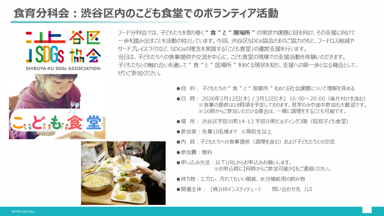 - 【NEW】食育分科会:渋谷区内のこども食堂でのボランティア活動